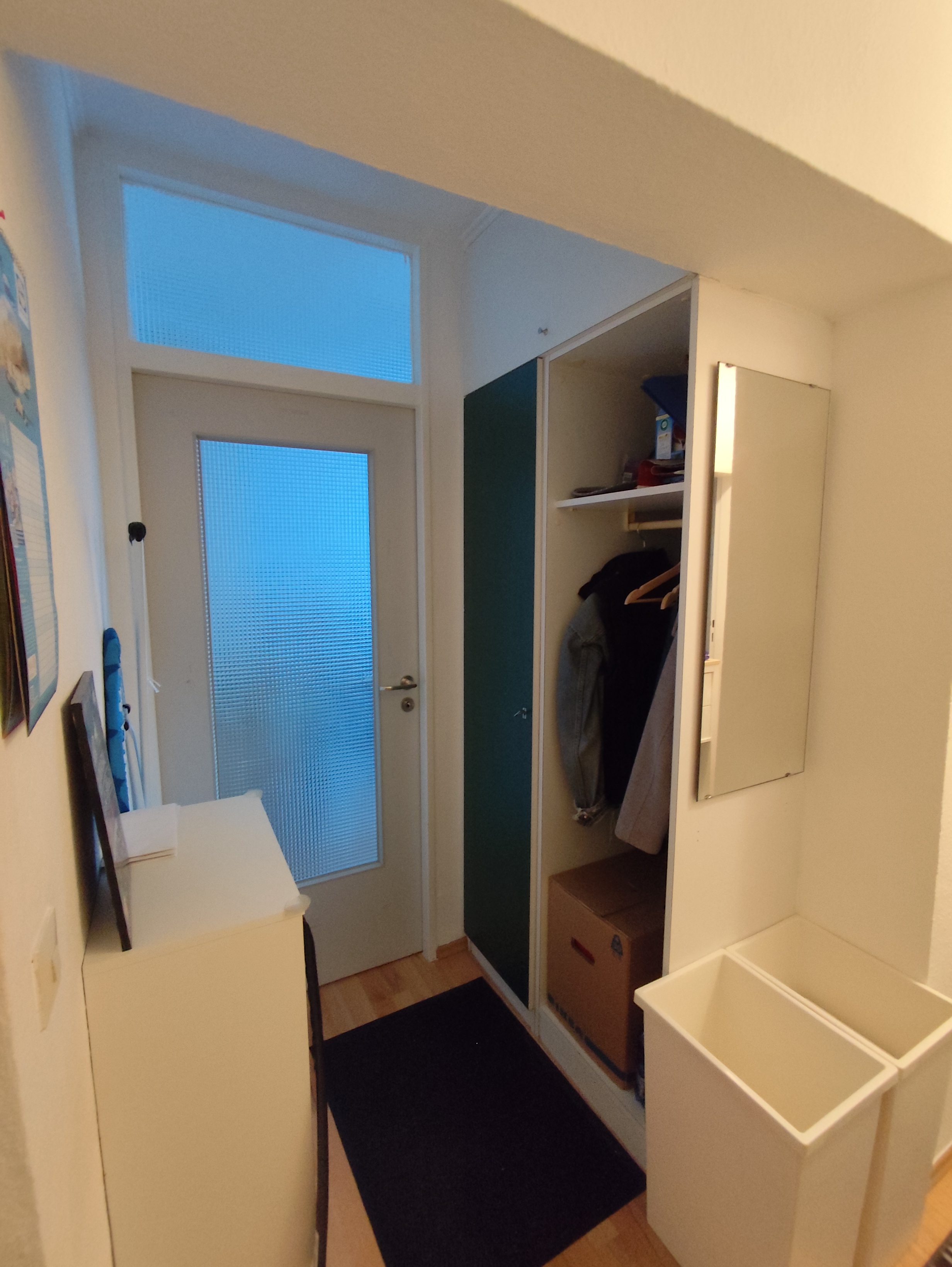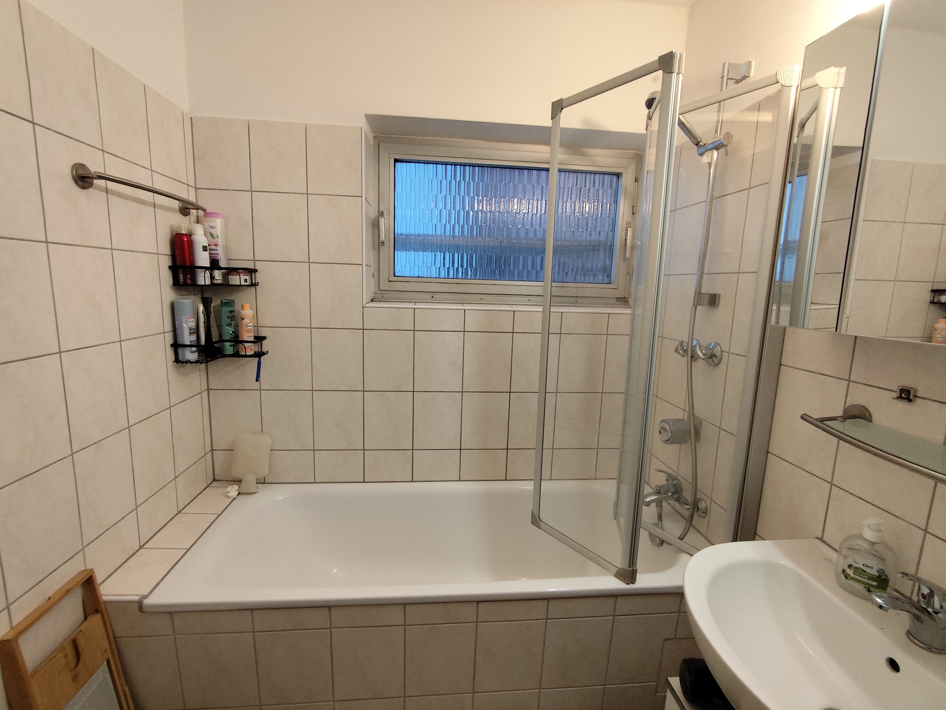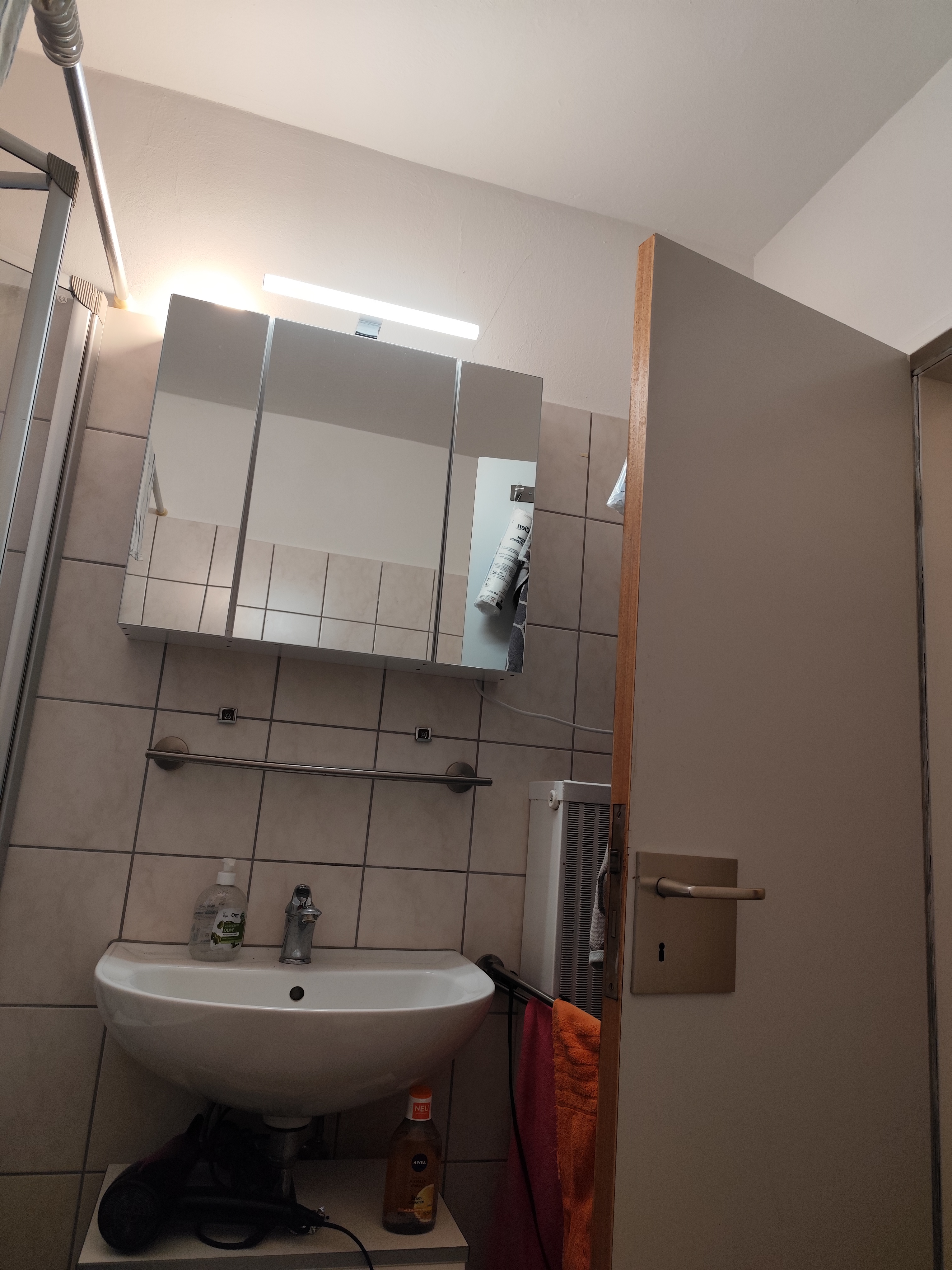Ein Schrank, Bad Ober und Unterschrank, Duschabtrennung können gegen Abstandszahlung vom Vormieter übernommen werden.