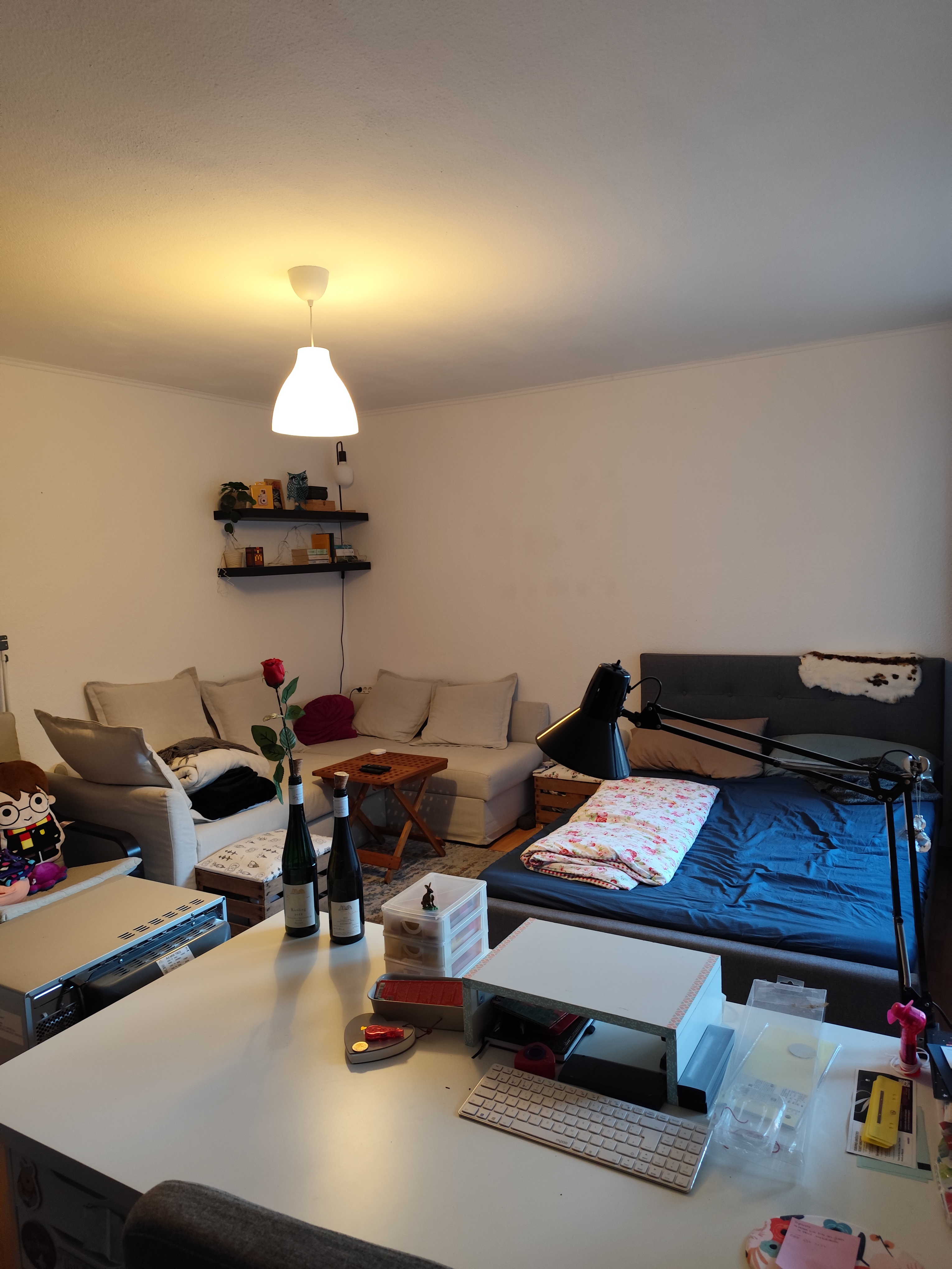 Das Wohn- Schlafzimmer grenzt an den Balkon.