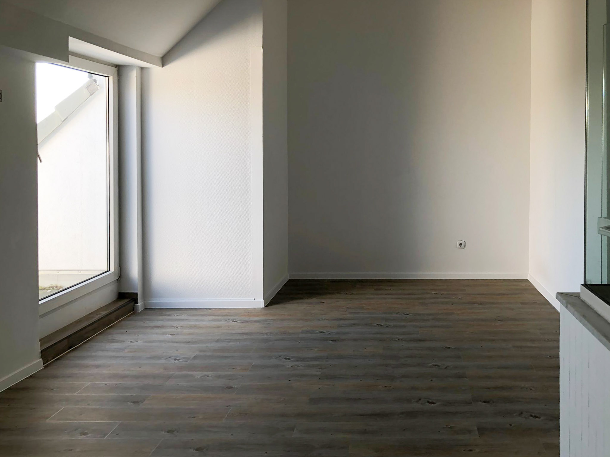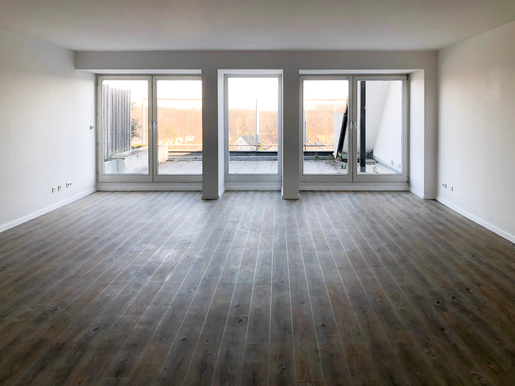 Auf der ersten Ebene finden Sie die Küche, ein Gäste-WC, eine Abstellkammer und das großzügige Wohnzimmer mit angrenzender Dachterrasse.