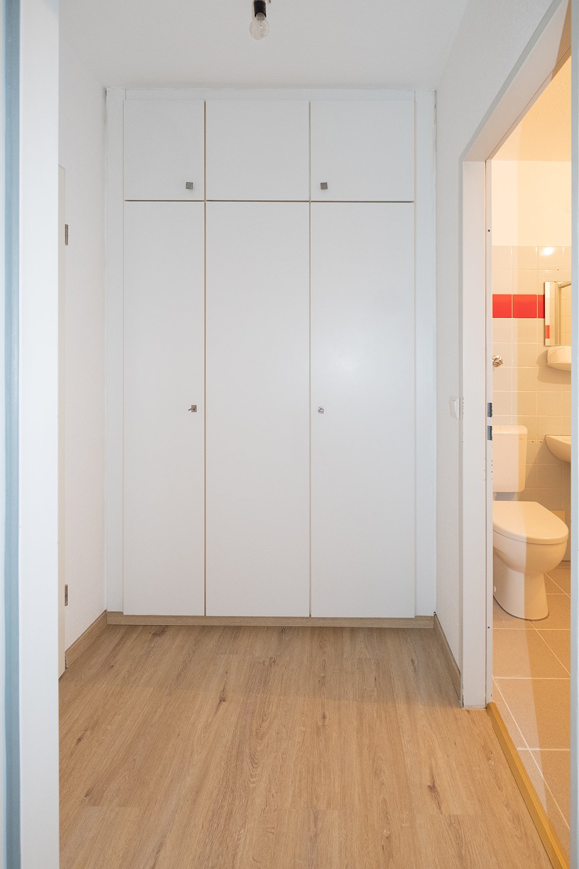 Die modern geschnittene Wohnung verfügt über ein Duschbad, eine Küche, ein Wohnzimmer, und ein Schlafzimmer. Im Flur wurde ein praktischer Einbauschrank eingebaut. Dieser bietet jede Menge Stauraum.